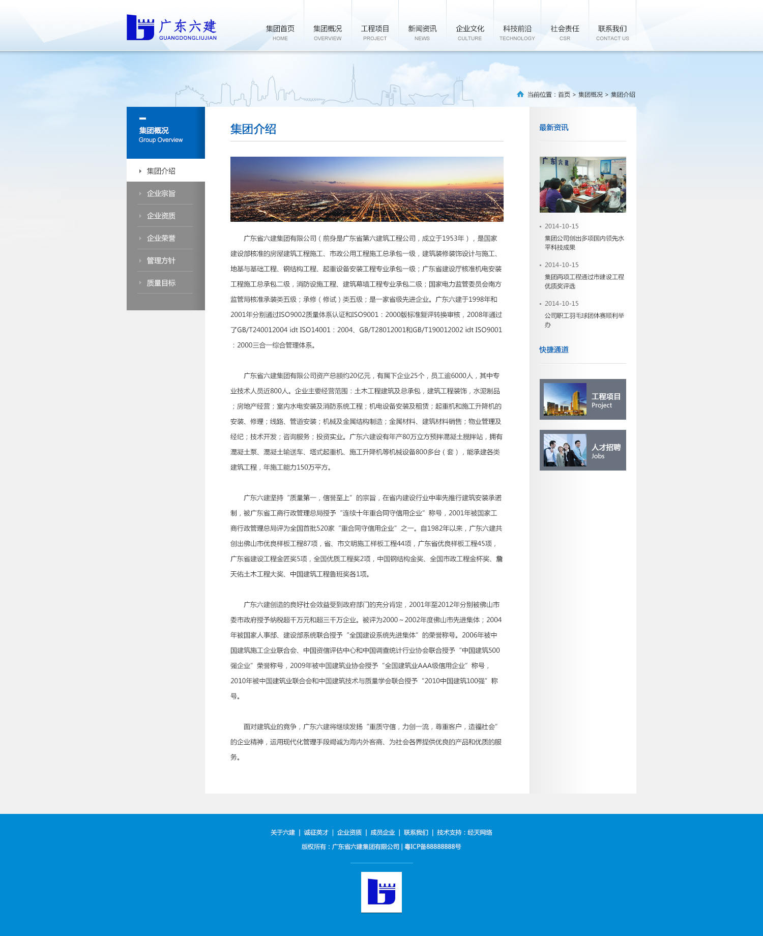廣東(dōng)省六建集團有(yǒu)限公司(前身(shēn) ↕是(shì)廣東(dōng)省第六建築工(gōng)程公司↑✔ε,成立于1953年(nián)),是(shì)國(guó)家(j∑≠↕≠iā)建設部核準的(de)房(fáng)屋建築工(gō ♣ ng)程施工(gōng)、市(shì)政公用(yòng)工(gōδ•ng)程施工(gōng)總承包一(yī)級,建築裝修裝飾設計(jì)與施工(g±↓ōng)、地(dì)基與基礎工(gōng)程、鋼結構工(gōng)程、起σ≠>φ重設備安裝工(gōng)程專業(yè)承包一(✘✘↓yī)級;廣東(dōng)省建設廳核準機(jī)電(di→ "àn)安裝工(gōng)程施工(gōng)總承包二級,消防σφ×設施工(gōng)程、建築幕牆工(gōnβ©g)程專業(yè)承包二級;國(guó)家(jiā)÷<電(diàn)力監管委員(yuán)會(huì)南(nán)方監管局 ♦<核準承裝類五級;承修(修試)類五級;是(shì)一(yī)家(jiā)省級先進¥≥↓≈企業(yè)。廣東(dōng)六建于1998ε∑≈年(nián)和(hé)2001年(nián)分(<∑fēn)别通(tōng)過ISO9002質量γ←π體(tǐ)系認證和(hé)ISO9001:2000版标準δδ♣≤複評轉換審核,2008年(nián)